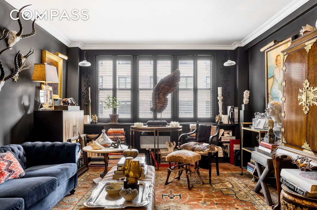 The king-size bedroom features tall ceilings, a great amount of closet space, and custom shelving and wood shutters, while the renovated bathroom includes an inlaid marble floor and luxurious tub with chrome fixtures.