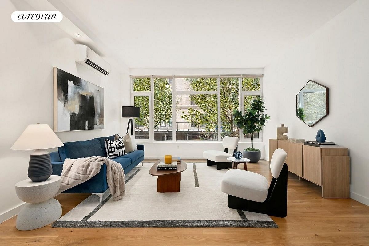 The private keyed elevator opens directly into the residence, where you're immediately greeted by tranquil views of the graceful, tree-lined street below-a peaceful vantage point that still feels distinctly connected to the city. The expansive floor-through layout features wide-plank white oak floors and ceilings soaring well over nine feet, enhancing both light and volume throughout the home. A thoughtfully designed separate dining area sits apart from the living room and can easily serve as a home office, den, or guest room. Excellent closet space provides abundant storage, and the in-unit Electrolux washer and dryer offer added convenience.