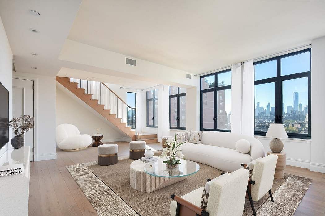 The crown jewel of the Village Green West condominium is a stylish, three-Bedroom, three and a half Bath, duplex Penthouse with a fabulous private roof deck as well as two additional balconies. With both northern and southern exposures, this 2800+ square foot apartment offers breathtaking, iconic views of the Freedom Tower, Hudson River, Hudson Yards and beyond.