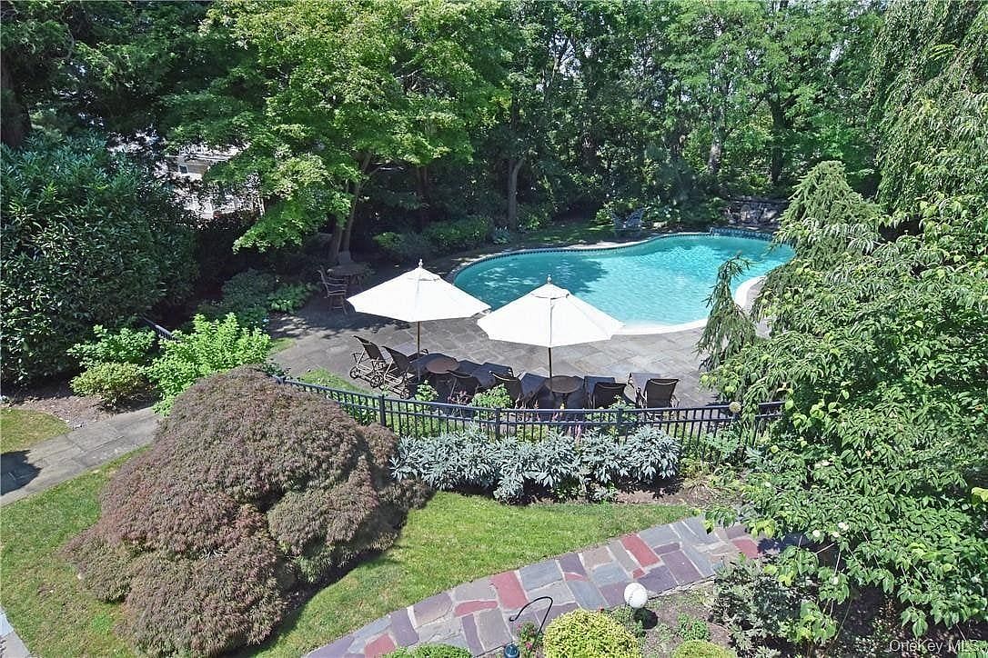Blending seamlessly into lush resort style surroundings, this luxurious 6,045 square foot 1894 Shingle Style home sits on a magnificent double 1 acre lot. Custom built with the most lavish materials and the finest handcrafted details of its era, there was no expense spared in the construction of this unique home. Enjoy a secluded gorgeous oasis with a spectacular in ground heated pool with a dramatic waterfall. Your outdoor barbecue is ready for summer grilling and you can sit on your multiple porches, balconies and slate patios surrounded by massive stone walls and beautifully manicured gardens. This romantic home is the perfect summer and winter retreat with numerous intimate sitting areas warmly lit by fireplaces and oversized open rooms that flow beautifully. The primary suite includes a large bedroom, generous sitting room, ensuite bathroom and walk in closet. There are 4 additional spacious bedrooms and 3 more bathrooms on the 2nd floor plus a bedroom, playroom, office, bath and lots of storage areas on the 3rd floor. You can pull into your 3 car garage from your long heated driveway in the front or enter through the gate on Corlies Avenue in the back. One of the first homes built in Pelham Heights, it is Ideally situated to Metro North, all schools, the town, parks and recreation areas. If you are looking for something truly special, this is it! You will fall in love from the moment you walk in the door!