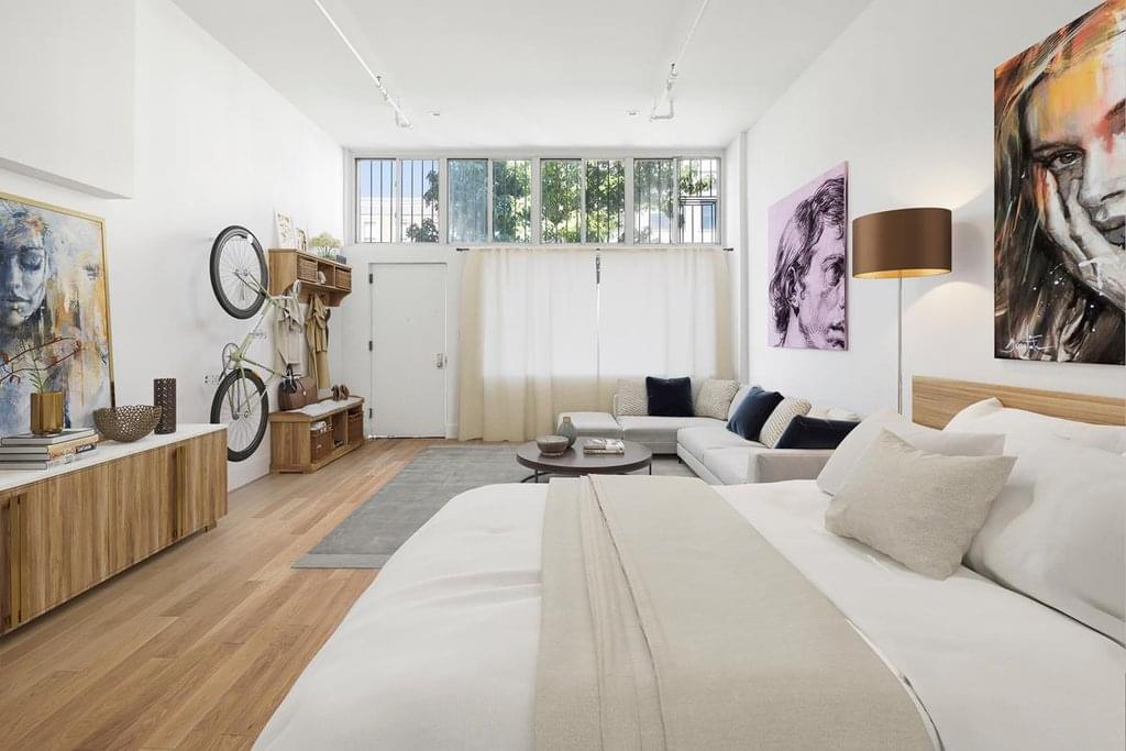 The well-appointed bedroom leads to two full bathrooms, ensuring maximum comfort and privacy. The masterful design extends to the sleek and stylish kitchen, centered around a large kitchen island, perfect for both culinary endeavors and casual dining experiences. Natural light floods the loft through a large skylight, infusing the space with an abundance of sunshine and creating an inviting ambiance throughout. The high ceilings further enhance the sense of openness and grandeur, making every corner of this loft an inviting space to unwind and relax. Step outside to discover your own private outdoor haven, where you can bask in the tranquility of your oasis, enjoying moments of peace and quiet or hosting memorable gatherings with friends and family.