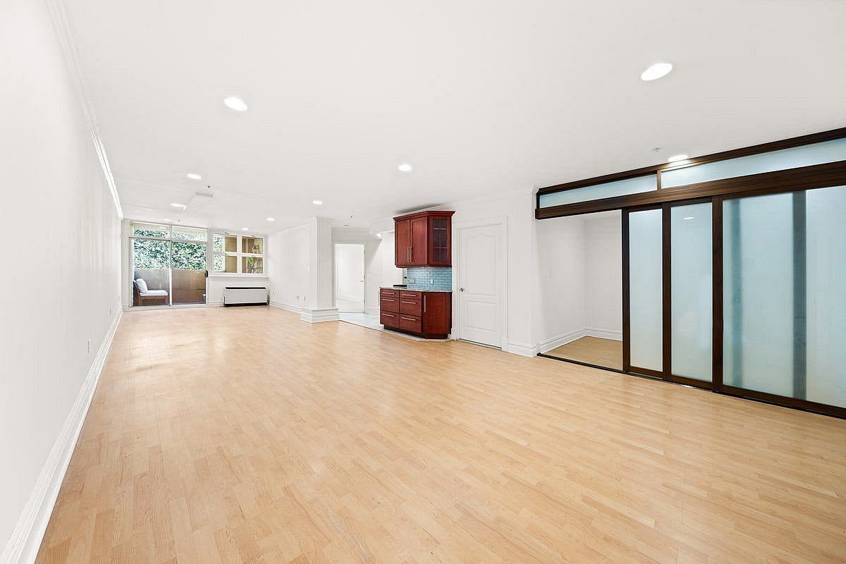 Apartment L310 is an expansive Astoria residence offering over 1,000 interior square feet with a highly functional and conventional layout. Configured as a one-bedroom with a substantial bonus room, the home can easily live as a true two-bedroom or a one-bedroom with dedicated office, nursery, or guest space. The 37+ foot living room accommodates separate living and dining areas with additional flexibility for work-from-home needs, while the front bonus room comfortably fits a king or queen bed with full furniture. The kitchen features wraparound countertops, a breakfast bar, full-size stainless steel appliances, and generous cabinetry. Recessed lighting runs throughout, complemented by a spacious bathroom, an oversized primary bedroom with a walk-in closet, a private terrace overlooking Astoria Park, and HVAC units in both the living area and primary bedroom.