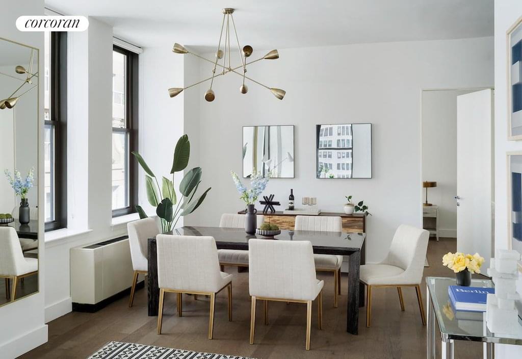 Residence 17F is a quiet, two-bedroom, two-bath home that is centered on a large and inviting living and dining area with bright southern and western exposures. This gathering space incorporates an inviting, open kitchen with paneled Poliform cabinetry, stainless steel appliances from Bosch, Miele, and Liebherr, Caesarstone countertops, and a Lazza crystalized breakfast bar, in addition to an in-residence washer and dryer. The primary bedroom comfortably fits a king-sized bed and has generous closet space. The en-suite primary bathroom features Waterworks crystal fittings, chinchilla mink marble countertops, Italian glass tiles, a built-in mirror and medicine cabinet, and a deep soaking tub. The secondary bathroom features chinchilla mink marble countertops, Italian glass penny tile, Waterworks crystal fittings, and a full-size soaking bathtub.