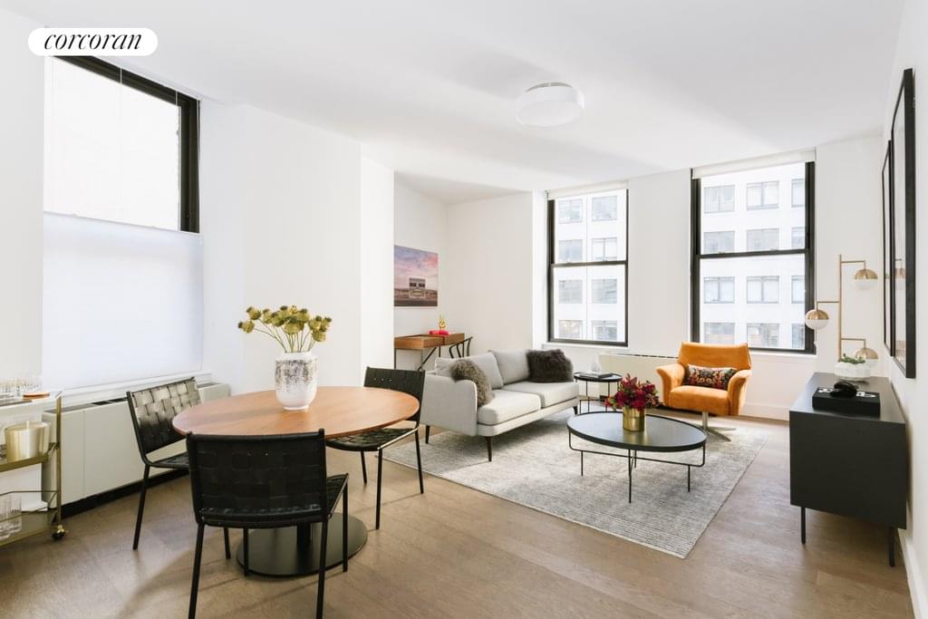 Residence 6F is a quiet, one-bedroom, one-bath home centered on an oversized living and dining area that overlooks tranquil Broad Street, a cobblestoned and historic pedestrian street. The communal space incorporates an inviting, windowed kitchen with paneled Poliform cabinetry, stainless steel appliances from Bosch, Miele, and Liebherr, Caesarstone countertops, and a Lazza crystalized breakfast bar, in addition to an in-residence washer and dryer. The primary bedroom, comfortably fitting a king-sized bed, has plenteous walk-in closet space. The en-suite primary bathroom features dual entry from the bedroom and foyer, with Waterworks crystal fittings, chinchilla mink marble countertops, Italian glass tiles, a built-in mirror and medicine cabinet, and a deep soaking tub.
