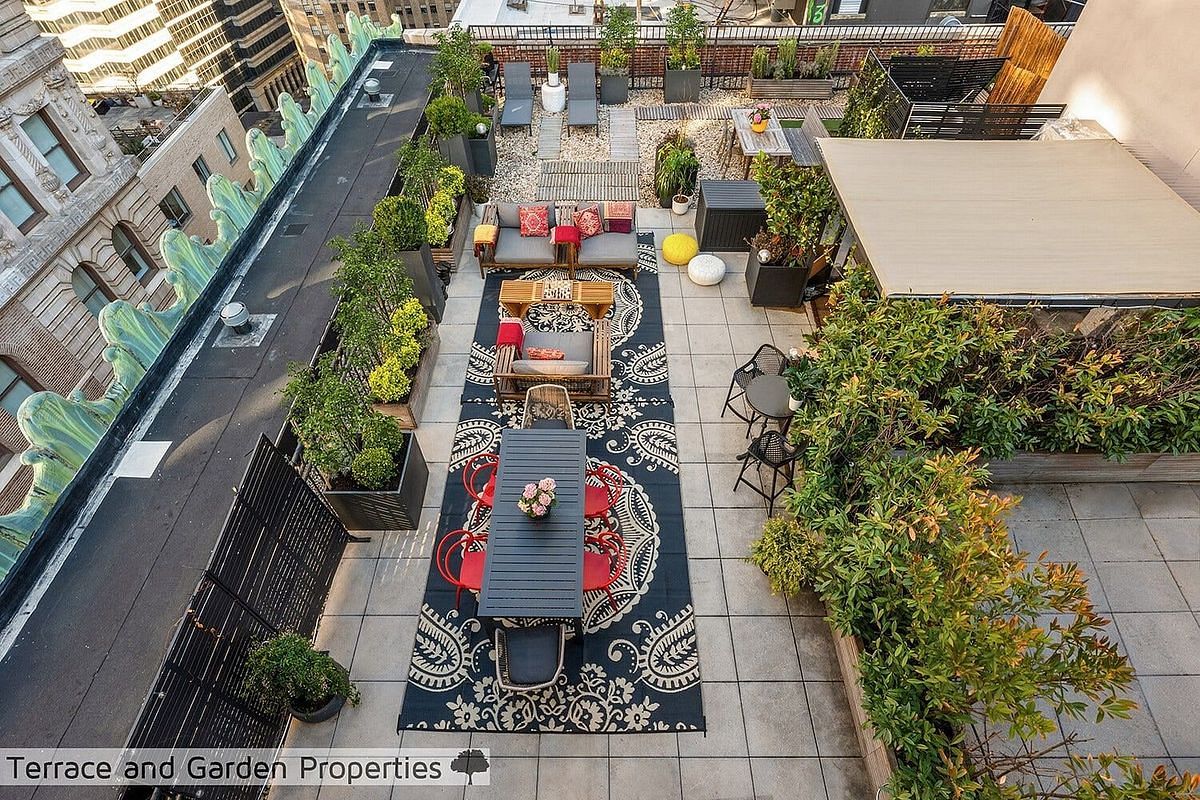 This extraordinary PENTHOUSE is a rare confluence of light, space, and refined living. Soaring ceilings, oversized windows, and art-friendly northern exposures create an atmosphere of quiet elegance, while the chef's kitchen, spa-like primary bath, and generous closet space speak to a home designed without compromise. Lush, landscaped terraces - including a grand entertaining terrace with a pergola, rare outdoor shower, and intimate private terrace off the primary suite - extend the living space into a verdant urban sanctuary. Set within the landmarked Broad Exchange Building on one of New York's most storied streets, crowned by an exceptional amenity offering, this is metropolitan living at its most magnificent.