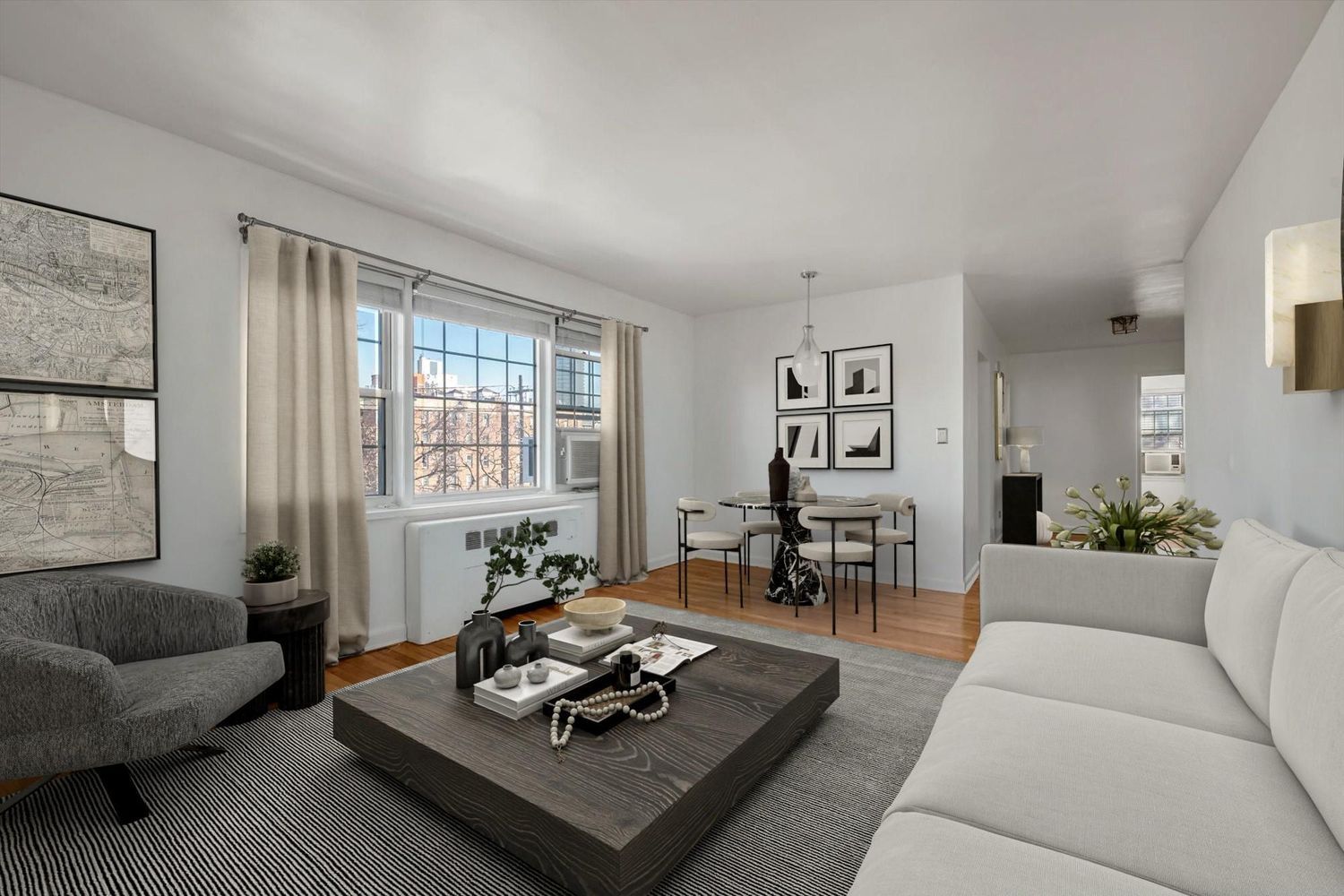 THE UNIT: Welcome to #5C... a most charming, quiet and comfortable, front-facing, corner apartment w/ a fantastic floor plan that offers max function & windows in every room! Enter to a spacious entry foyer situated at the center the unit's ideal layout. To the far left lies a grand living room w/ formal dining area & plenty of extra square footage for an additional area of use such as a home office! Next, a renovated, windowed galley kitchen w/ a clean, modern aesthetic, lots of cabinetry & stainless steel appliances w/ a dishwasher is a pleasure to cook in. Off to the right of the entry foyer, take a hall of wall-to-wall, floor to ceiling closets to a nicely updated, windowed bathroom and a dreamy, oversized and quiet corner master bedroom w/ extra room, great closet space and dual window exposures. Other notable highlights include large windows, gorgeous & shiny wood floors, smooth walls, plenty of electrical outlets throughout and much more! This one is not to be missed!