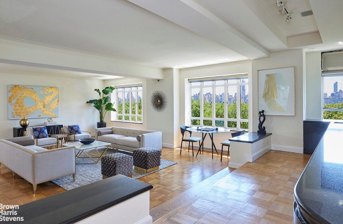 One of the largest layouts at The Century, almost 3,000 Square Feet with 65 Linear Feet directly facing the Park, it was formerly nine rooms now configured into six. The seamless combination of a Classic Six and a Park View One Bedroom Duplex provides magnificent space, views & light. From the semi-private hallway on the ninth floor, one enters an impressive double width step-down Living Room that also encompasses the lower level of the duplex. Two large bay windows deliver outstanding views of the park as well as the 5th Avenue and Central Park South skylines. A third window is directly above the well-concealed wet bar. The spacious, serene Primary Bedroom Suite also overlooks the park.
