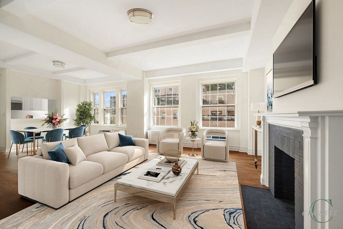 Enter 12A at 25 Fifth Avenue to discover beautiful southern light from 5 large windows in the living and dining room. There is ample space for gracious living, dining and entertaining that is enhanced by a working fireplace! The windowed kitchen has appliances by Bertazzoni, Bosch and Liebherr and includes a wine cooler, all to create the perfect space to prepare for entertaining or to work on your favorite recipes. The primary corner bedroom has views south and west with incredible light and city and Fifth Avenue views. The second bedroom with views of Fifth Avenue provides a comfortable respite with space for all of the bedroom furniture you could want. The primary windowed bathroom is clad in marble and includes a stall shower and a pedestal sink. The third bedroom facing south is the perfect guest room or home office with its own windowed bathroom. This residence includes a washer dryer and through the wall air conditioning!