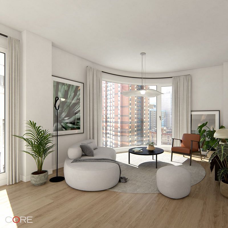 Enter Residence 5A, a spacious and airy two-bedroom sanctuary filled with natural light pouring through floor-to-ceiling oversized windows. The open kitchen is a culinary masterpiece, featuring pristine marble countertops, a striking backsplash, and an island complemented by sleek white lacquer cabinets. Integrated high-end appliances, including a Thermador refrigerator and Bosch dishwasher, ensure a seamless cooking experience. Every residence is thoughtfully equipped with central air conditioning, an in-unit washer and dryer, and a smart entry lock for your convenience.
