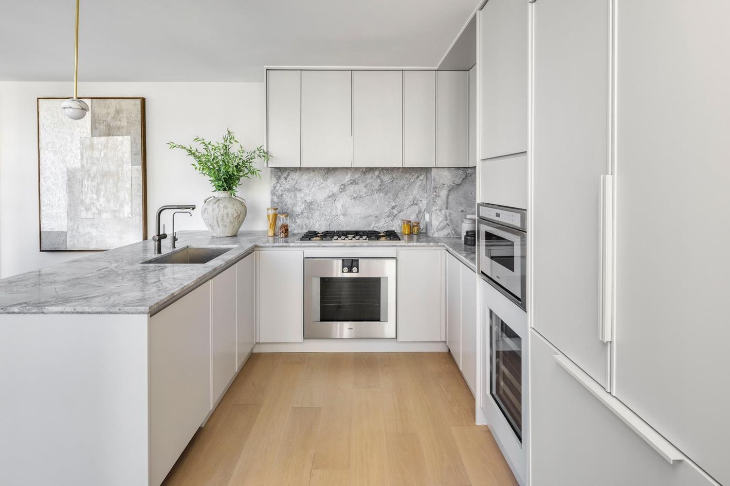 Penthouse C is a bright and airy one-bedroom sanctuary with a private rooftop space. Natural light pours through floor-to-ceiling oversized windows, enhancing the spacious ambiance. The open kitchen is a culinary masterpiece, featuring pristine marble countertops, a striking backsplash, and a spacious island framed by sleek white lacquer cabinetry. Integrated high-end appliances, including a Thermador refrigerator and Bosch dishwasher, ensure a seamless cooking experience. Thoughtfully designed for modern living, this exceptional residence is equipped with central air conditioning, an in-unit washer and dryer, and a smart entry lock for ultimate convenience.