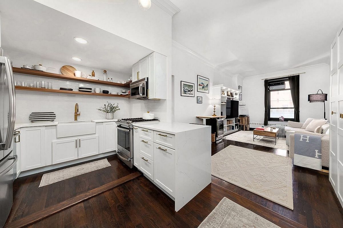 The recently renovated kitchen features a spacious wraparound quartz countertop, a deep farmhouse kitchen sink, open shelving, stainless steel appliances, plus numerous storage drawers with gold hardware.