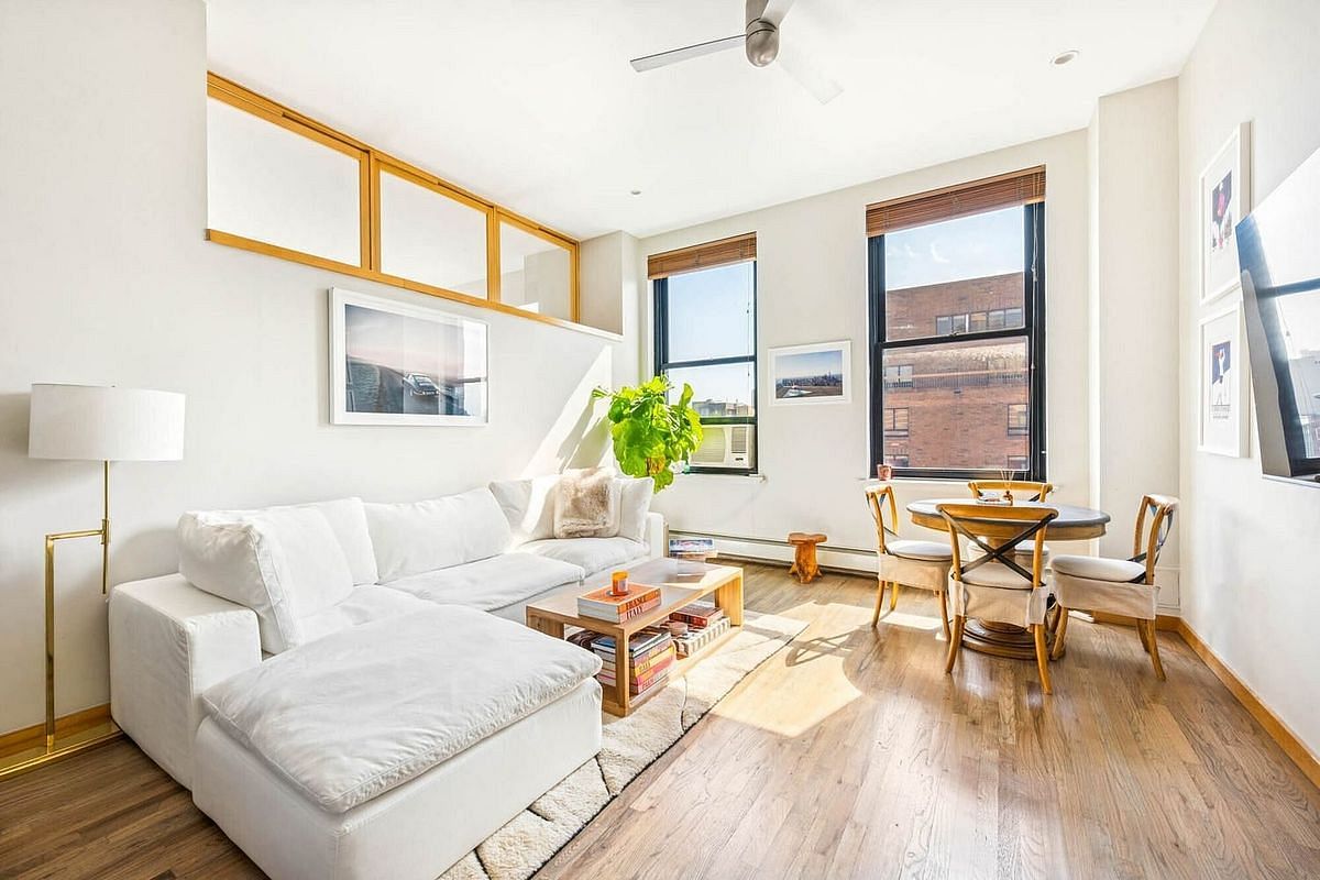 TOP FLOOR CORNER UNIT WITH SOUTH AND EAST EXPOSURES Enjoy stunning sunlight and sweeping city views from this top floor renovated Noho/Greenwich Village loft. Featuring 12 ft +/- tall ceilings, giant windows, and all day sunshine, this generously proportioned home offers a wonderful retreat high above the bustling city below. A flexible layout allows for a serene home to relax and unwind in or a peaceful place to work. Bask in terrific sunlight throughout the day and enjoy blue skies and village views on the top floor of a 12 story building. With large and tall walls throughout the home, youll have plenty of space to display your art, books, and creativity. A renovated kitchen has been tastefully designed and outfitted with grey slate countertops, a Sub-zero refrigerator, and a Miele gas range, oven, and dishwasher. The bathroom is finished with floor to ceiling deep gray slate tile and includes a deep soaking tub. You'll also find an in unit washer and dryer, a true luxury and convenience for city living. The oversized king bedroom is absolutely breathtaking and greets you with two oversized windows facing south and east, providing open city views high above Noho and Great Jones St. A dramatic industrial style steel staircase leads to a dedicted office alcove as well as a the private 2nd sleeping area. Throughout the home you'll also enjoy six large closets providing plenty of room for your storage needs. 250 Mercer is a beautiful pre-war converted loft building featuring a 24 hour door-person, a live-in super, multiple laundry facilities on-site, resident roof-deck and courtyard. Pets are welcome for shareholders and there is an unlimited sublet policy after two years of ownership. Pied e terre is permitted. Centrally located within a few blocks of Washington Square Park, the building sits on the border of Greenwich Village, Noho, and Soho. Live in one of the most vibrant and desirable areas of Manhattan with easy access to extensive dining options, shopping, nightlife, and transportation.