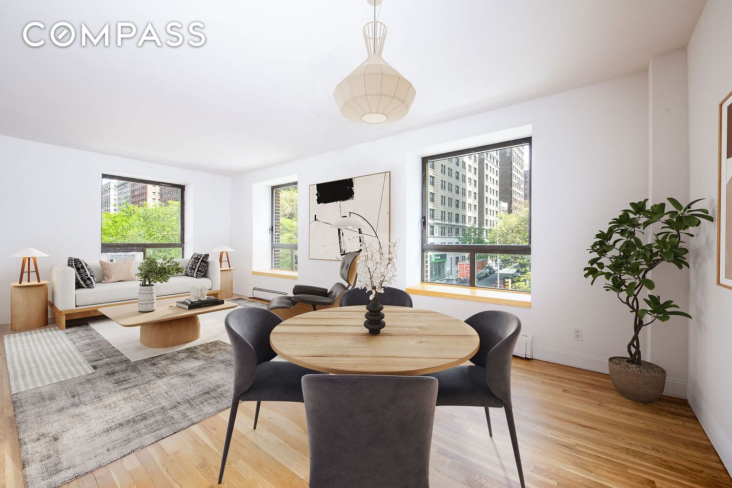 Living/Dining Room: The grandly proportioned room easily accommodates a dining area and spacious living room. With three large windows and dual exposures, East and North, the living and dining room is filled with light all day long.