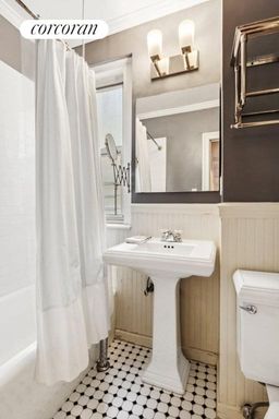 The large, windowed full bathroom features classically elegant New York finishes with a cast iron tub, white subway tiles and pedestal sink.