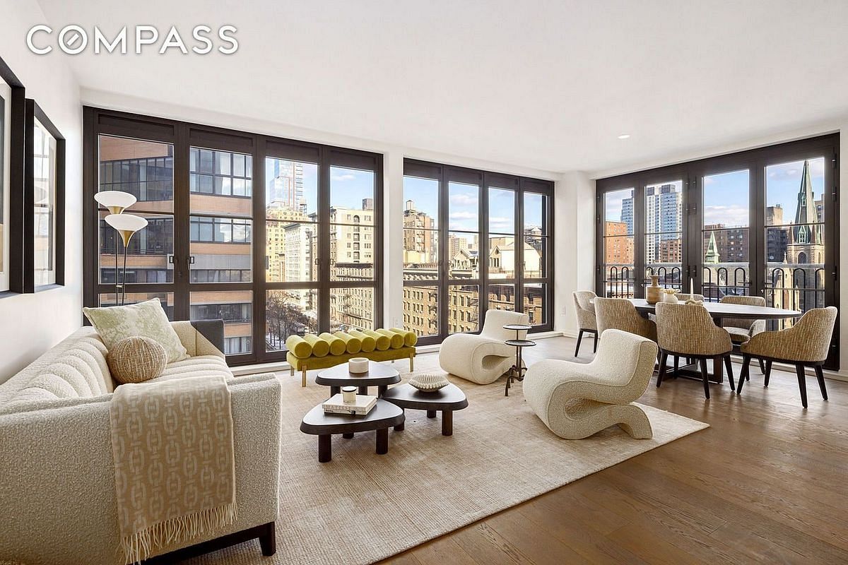 Residents enjoy a 75-foot saltwater lap pool, fitness center with separate Pilates and yoga rooms, regulation-size squash court and half-basketball court, private dining room with catering kitchen, music room, childrens playroom, teen club lounge, and a landscaped rooftop terrace with an outdoor cinema and separate dining and grilling areas.