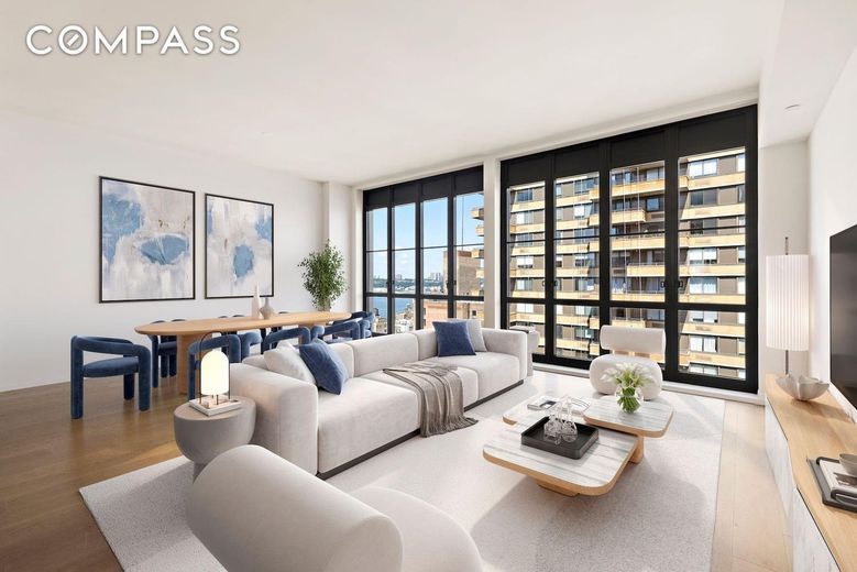 Welcome to Residence 18B, a gracious and beautifully bright 1,382 square foot 2 bedroom, 2.5 bath apartment with north-facing floor-to-ceiling casement windows, expansive city views, and 108 foot ceilings! A foyer with two large coat closets leads to the spacious living/dining room and open chefs kitchen with custom Italian solid white oak cabinets featuring exposed dovetail joinery, elegant inlay detail, and under-cabinet lighting.