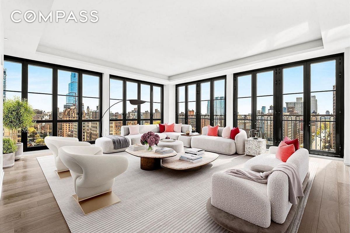 Presenting a luxurious corner residence with a great room featuring windows that face all four directions. Natural light abounds with endless views to the east, south, north and west. This residence spans 2,411 square feet with three bedrooms, three and a half baths, and 10'8" ceiling height. This exquisite apartment showcases an expansive living room, complemented by a separate dining area which can be used as a 4th bedroom, and floor-to-ceiling casement windows unveiling breathtaking panoramas stretching from the Hudson River to Central Park and the downtown skyline. The gourmet chef's kitchen boasts top-of-the-line features including Brazilian desert quartzite counters, solid Italian white-oak cabinets and a marble backsplash. Stainless-steel appliances include a Wolf gas range with grill and vented hood, Sub-Zero refrigerator and dishwasher, and a wine fridge. A versatile moveable island, fashioned in white oak and Brazilian desert quartzite, comfortably seats six and offers additional counter space or a casual dining spot. The primary suite is adorned with east-facing floor-to-ceiling windows, a spacious dressing closet, secondary closet, and an indulgent windowed en-suite bath with five fixtures. This opulent bath boasts radiant heated white marble floors, a white marble vanity with dual Kohler sinks, Waterworks fixtures, a marble surround soaking tub, glass-enclosed marble shower, and an enclosed WC with Toto Neorest commode. Each additional bedroom enjoys abundant natural light through east-facing floor-to-ceiling windows and features en-suite marble baths with wall-hung Toto toilets. Additional highlights include an elegant powder room with marble floor and vessel sink, a vented LG washer/dryer, exquisite 7 1/2" wide European oak flooring, and a Nest-controlled heat pump HVAC system with linear diffusers. Nestled amidst Riverside and Central Parks, 96+Broadway is a new luxury full-service condominium. Residents enjoy an array of amenities including a 75-foot saltwater lap pool, sauna, steam room, fitness center with pilates and yoga, a regulation-size squash court with a basketball hoop, rooftop lounge with outdoor cinema, music room, playroom, dining lounge, and clubroom.