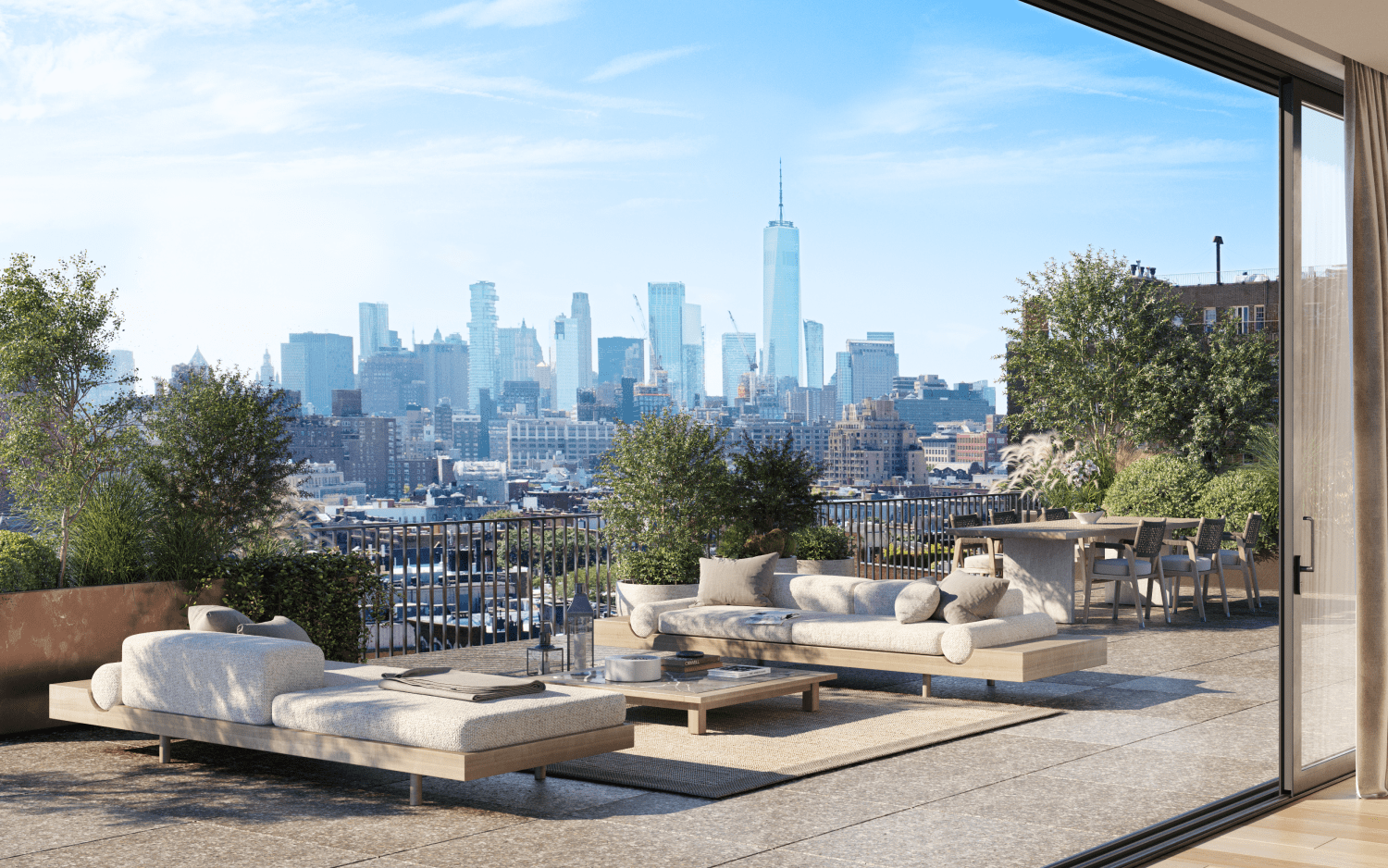 An ultra-spacious sun-flooded Condo imbued with warm organic tones and upscale European designer finishes, this brand new split2-bedroom, 2.5-bathroom home is the quintessence of urban luxury and style with a private massive 481 sq ft south facing terrace offering the best in indoor/outdoor living.The terrace features sweeping panoramic south views of the NYC skyline, including the Freedom Tower, which are equally stunning day and night. This South facing terrace is perfect for entertaining, lounging, and al fresco dining.In the interior, airy ceilings over 9.5 ft. high hover above beautiful oak floors. Massive picture windows with custom banquette seating frame classic city views and allow steady streams of natural light to permeate interiors from dawn to dusk.