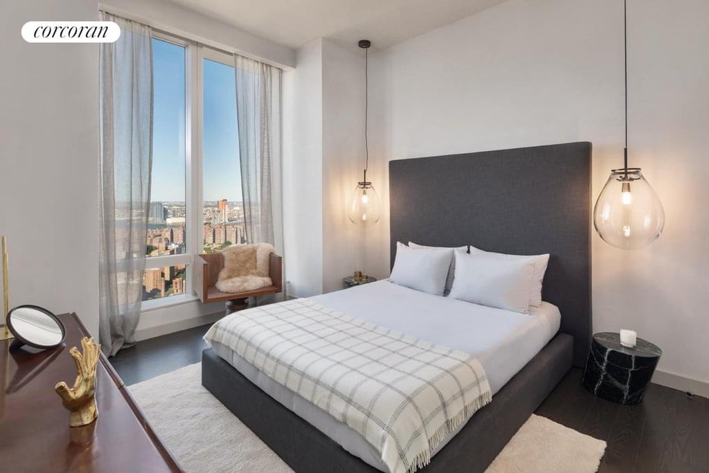 Residence 42H is a 696 square foot one bedroom, one bathroom with an open gourmet kitchen and breakfast bar. This spacious residence faces North East with East River and Williamsburg Bridge views. Warm, modern interiors are brought to life by the renowned design team at Meyer Davis Studio. This residence features imported stone and custom finishes, premium Miele appliance package, 5" wide stained oak flooring, master bath with custom wood cabinetry, marble tile walls and mosaic floors with radiant heat, under-mount Wetstyle sink with glass vanity top and Dornbracht polished chrome faucets and a washer and dryer.