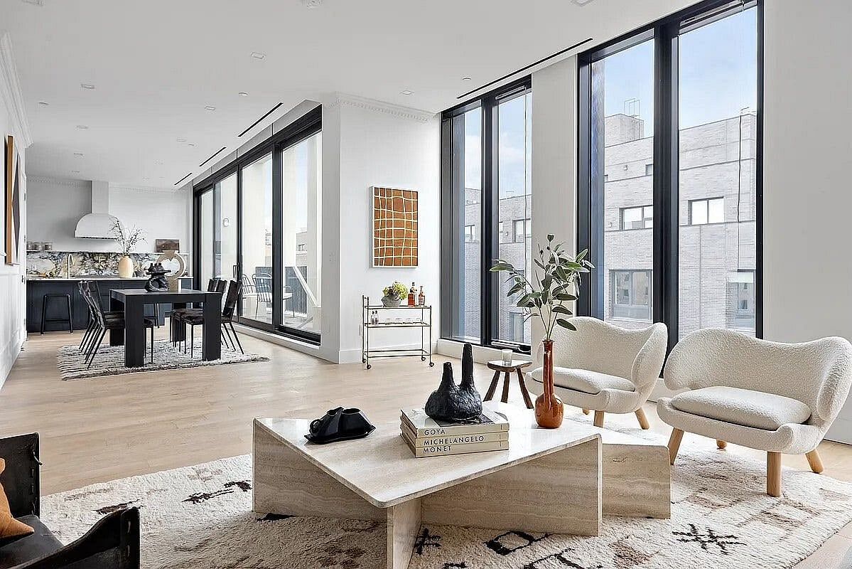 White oak hardwood planks run throughout, complemented by black steel accents and walls of glass that bring a chic mixed-material aesthetic to the home. Just off the kitchen, a sliding glass door opens to the front terrace, seamlessly blending indoor and outdoor living. This level also includes a powder room and a spacious bedroom with its own terrace.