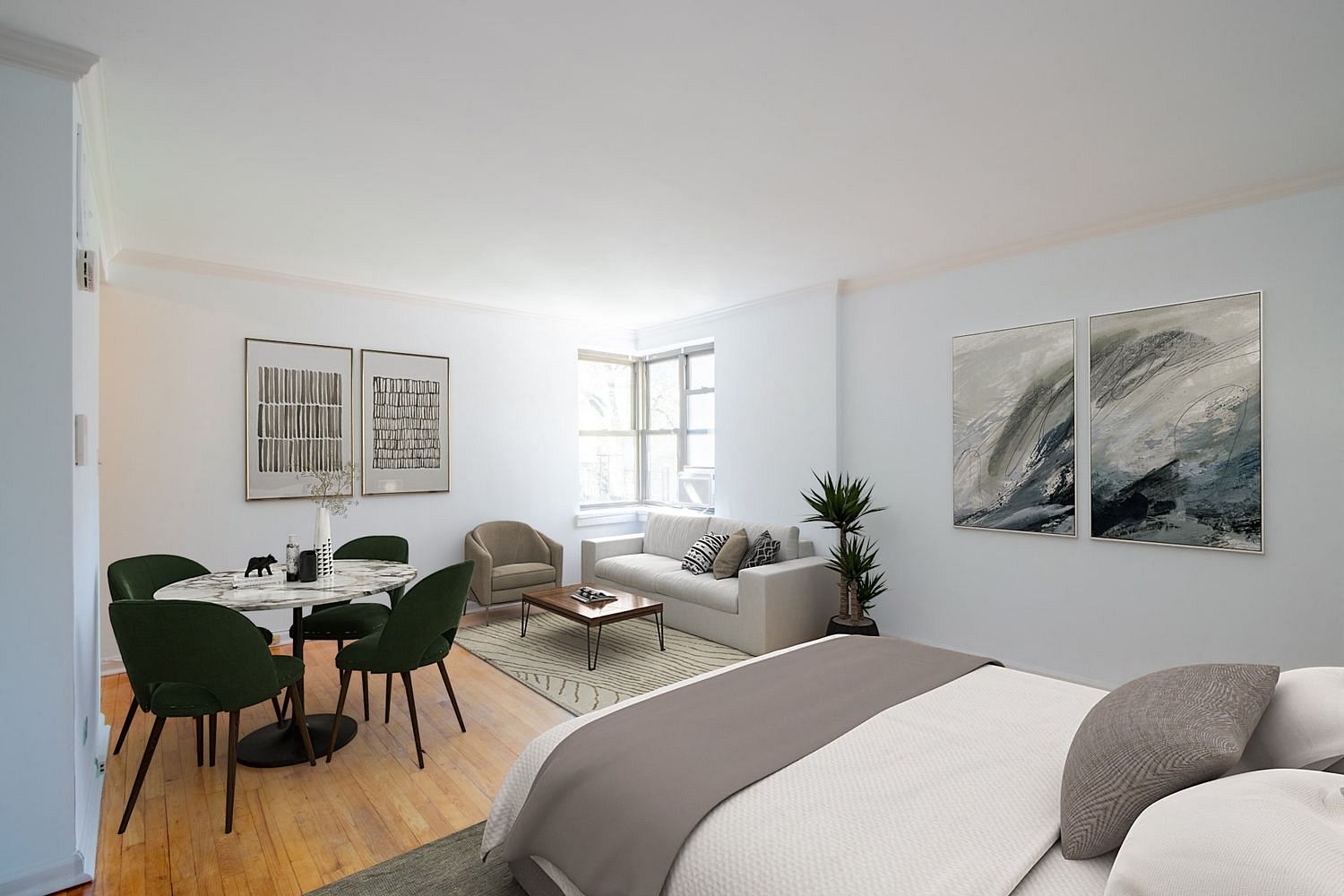 ***NEW HIGH-END BATH RENOVATION***This cheerful studio apartment gets sparkling sunshine in the morning and early afternoon. Stainless-steel appliances, including dishwasher, are featured in the good-condition kitchen. Hardwood floor in great shape. Bathroom brand-new and pristine. Freshly painted all around. This home is a beautiful, affordable, move-right-in blank slate to arrange exactly the way you want. Plus, you get an amazingly low maintenance.