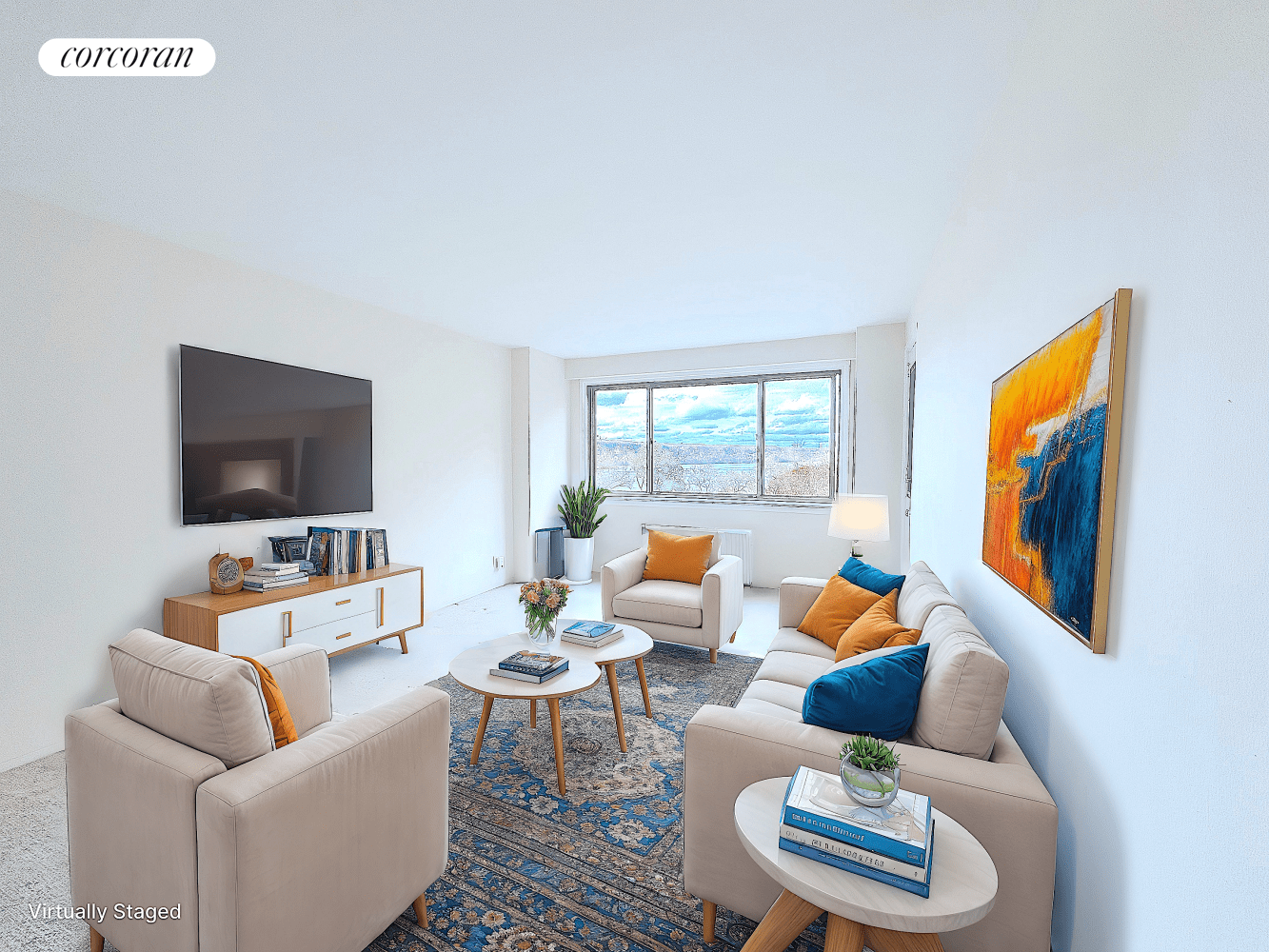 This bright and spacious 1-bedroom co-op offers stunning views of the Hudson River and Palisades from your living room, bedroom, and private fully enclosed terrace.