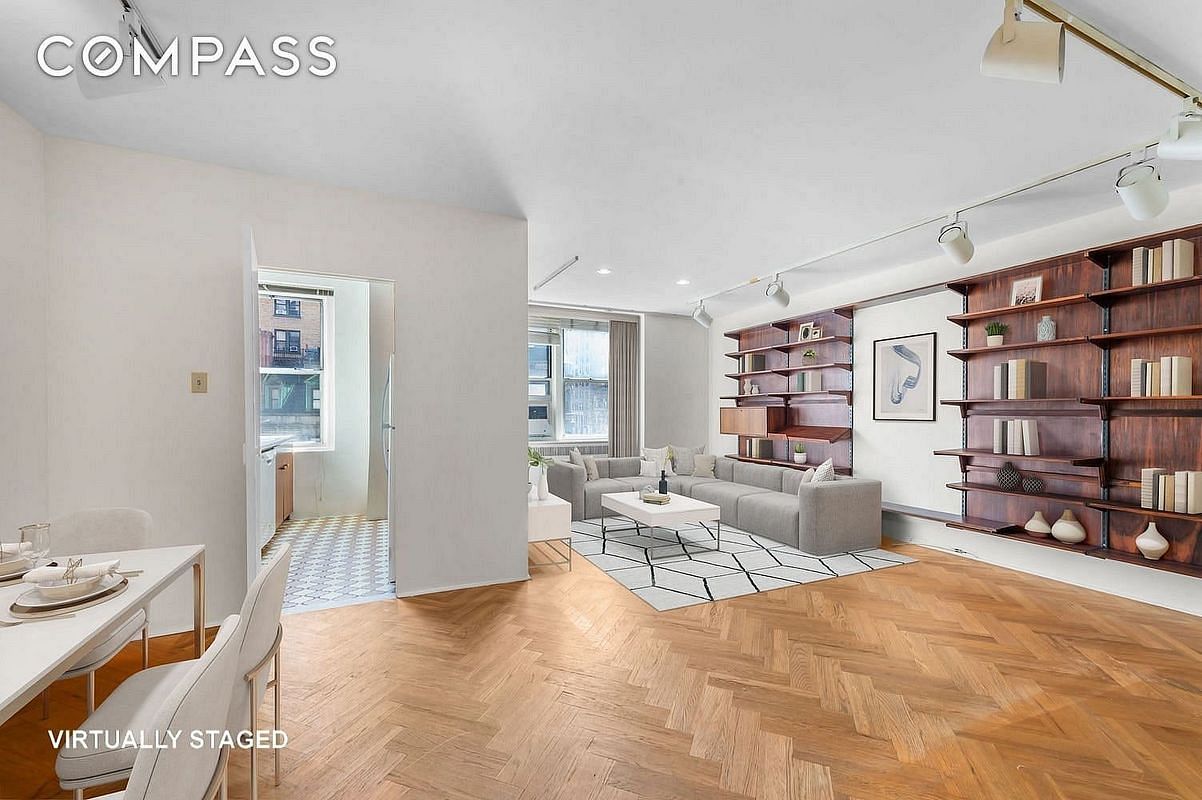 Bring your architect and create your dream home within this gorgeous 1920's building located on the Upper West side. The bones of this apartment are ready for their new owner to achieve a gracious home within the walls of this well thought out apartment. Be welcomed by Herringbone wood floors and lovely light flowing into this unit from the east. Thoughtfully laid out for living and dining, adding a home office (or big walk in closet) to the side. The bedroom is massive and has an interesting layer of ceiling beams which make it look very lofty. Lots of closets and a large downstairs storage unit with whopping 11 foot ceilings for your convenience.
