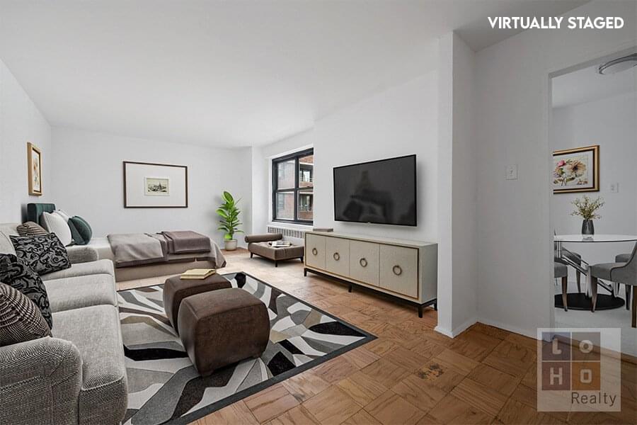 Great Location & Priced to Sell! This is the ideal apartment to customize from start-to-finish and make your own! The large living area of this generously proportioned studio (with windows facing southwest), can easily be converted into a 1-bedroom apartment simply by adding a wall at the far end. To the right of the living area is the full sized, eat-in kitchen (windowed). The wall between the living area and kitchen can be opened to create a pass through, dining island or even be completely removed for a more expansive space (see alt. layout!) Three (3) large closets and newly refinished parquet floors throughout.