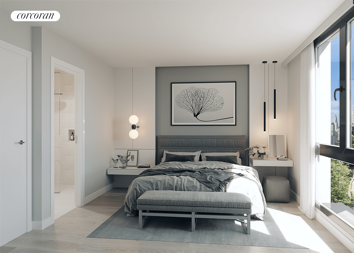 Natural light streams into your home reflecting on the Porcelanosa wide plank Lutier Grey engineered hardwood floors. Sit back in your living room and savor the beautiful skyline views. The energy-efficient climate control system ensures your comfort year-round.