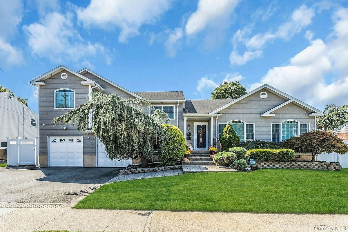 Welcome to this beautifully maintained expanded 5 level split home located in the desirable Massapequa School District. Situated on an ample 80x100 property, this spacious home offers 4 bedrooms, 4 full bathrooms, plus a convenient home office- perfect for today's busy lifestyle. Step inside the bright and open living room & formal dining room with hardwood floors & recessed lighting. The kitchen boasts a brand-new white quartz countertop and subway tile backsplash. Sliders off the dining room leads to a private paved patio and fenced in yard perfect for entertaining. Yard also has 2 sheds and a full sprinkler system. Upstairs, the primary bedroom features a floor to ceiling custom shoe rack, a massive walk-in closet, and a spa like ensuite bathroom equipped with jacuzzi soaking tub & separate shower. Cathedral ceiling compliments the space. Additional bedrooms are generously sized with yet another ensuite bathroom and one conveniently located in the hall. A walk-up storage attic with flooring provides incredible bonus space. The lower level offers even more living space with a spacious den, full bathroom, and a convenient wet bar, perfect for hosting guests. The home is designed for comfort & convenience with central a/c (2 new compressors) gas heat (Navien system) two zone heat, 200-amp service with an additional 100-amp subpanel. Additional highlights include a rare 3 car garage, Anderson windows, and just minutes to either Seaford LIRR or Massapequa LIRR, parks, shops and schools. Bring the whole family! Possible Mother/Daughter with proper permits.