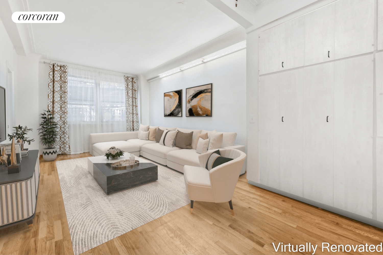 Discover the perfect starter apartment or Pied-a-Terre in this spacious, rarely available alcove studio, which can effortlessly be converted into a Jr. 1 Bedroom. This charming Pre-War gem features: