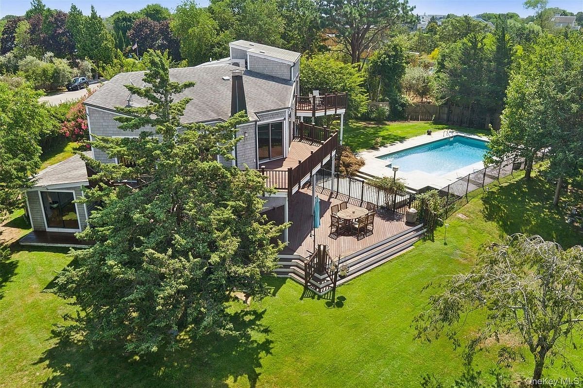 Village Contemporary with Pool and Water Access. Tucked away on a quiet cul-de-sac, this shingle-style contemporary offers both privacy and proximity to all the Hamptons have to offer. Just over a mile from Westhampton Beach's Main Street and with direct water access in the backyard, the four-bedroom, three-bath home is designed for effortless indoor-outdoor living. Every level features floor-to-ceiling windows that flood the interior with natural light and frame dramatic sunset views. Sliding doors extend to multiple decks, a pool and spa with a bluestone surround, and park-like grounds enhanced by mature specimen trees and bordered by a stream leading out to Moriches Bay. Inside, the main level features a sun-filled great room with vaulted ceilings, a wood-burning fireplace, and open views. There are two bedrooms on the ground floor, including one en-suite; a third bedroom with outdoor access is on the main level; and the upstairs primary suite features a private balcony. Additional highlights include a wine cellar and a detached bonus space, perfect for a home office, gym, or guest quarters. This property is a true resort-style retreat, close to shops and ocean beaches, perfect for both seasonal or year-round living. Welcome home!