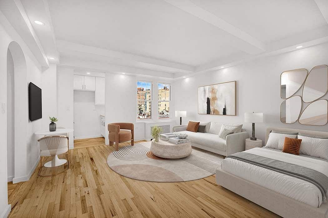 Apartment 8A has a separate entry foyer lined with a wall of closets. The arched entry way leads to the main living area which has original hardwood floors in perfect condition, a huge walk-in closet, and recessed lighting throughout with dimmers.