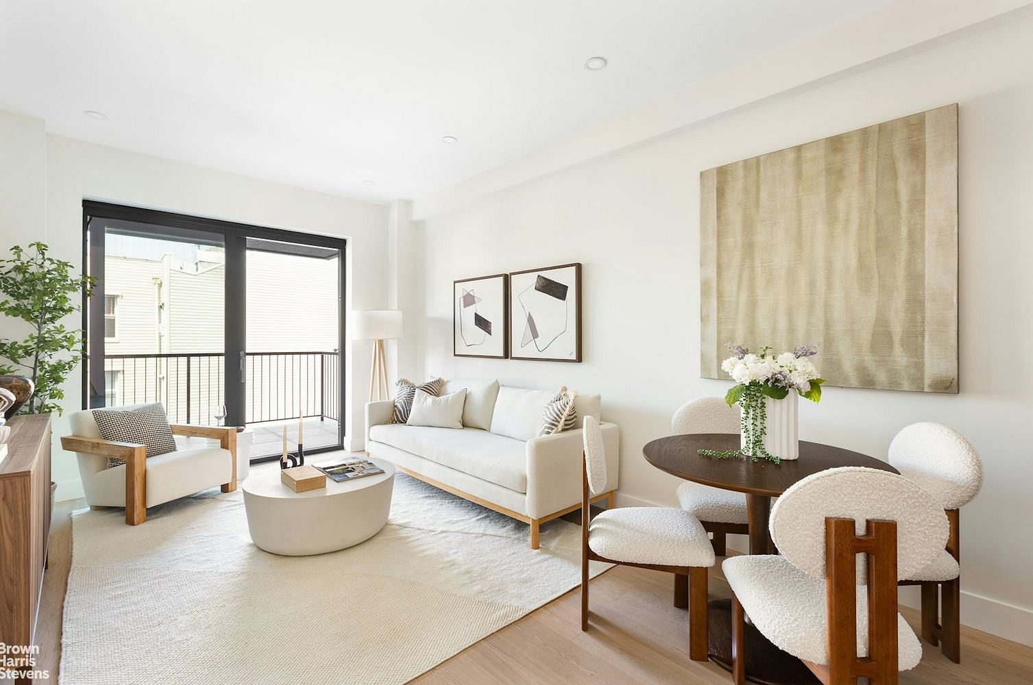 Residence 1A's 1 bedroom, 1 bathroom duplex layout exemplifies the pinnacle of luxury living. The interiors are adorned with rich white oak engineered wood floors, creating a warm and inviting atmosphere. The spacious and open floor plan allows for effortless entertaining and comfortable living leading out to a private garden. The state-of-the-art kitchen is a chef's dream, featuring sleek white countertops and a blend of custom painted wood shaker cabinetry and elegant open shelving that enhance the clean, modern aesthetic. High-end appliances by Bosch ensure every meal is prepared to perfection.