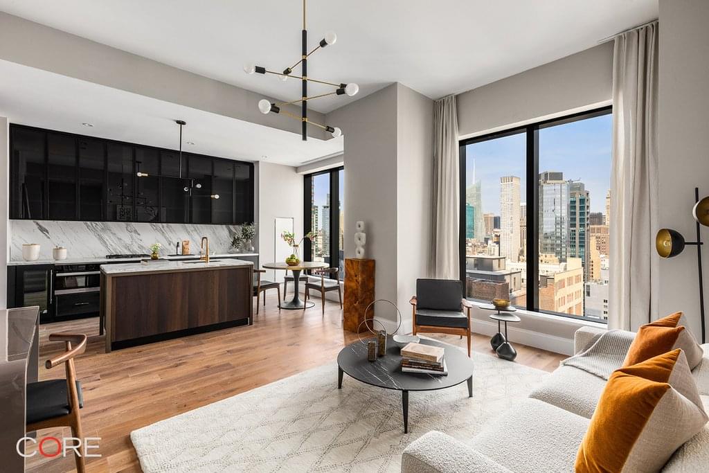 Residence 36B is an 803 SF one bedroom, one bath with a fantastic northern view overlooking iconic architecture. Flexible by design, the floor plan allows for an oversized studio or a one bedroom. Interiors boast rusticated hardwood floors, bronze-finished hardware, and soaring 11-foot ceilings with window heights of nine feet. The open kitchen with Miele appliances features custom ultra-matte, dark charcoal woodwork, metal-framed glass upper cabinetry, and Calacatta-honed marble countertops. Ample closet space and a washer/dryer complete this ideal home, which can be augmented with storage available at additional cost.