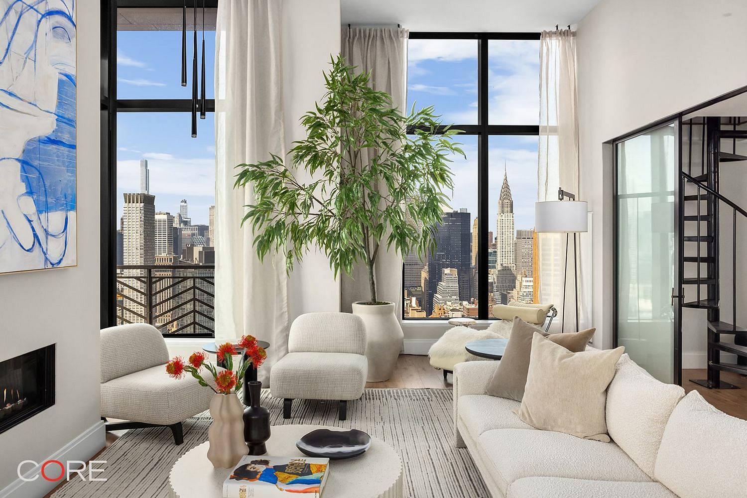 Penthouse B is a 2,610 SF three-bedroom, three-bath residence with an oversized living room, eat-in kitchen, additional study/lounge area with a custom-built overhead loft space, two working fireplaces, and extraordinary views. This fantastic duplex home offers northeast, west, and southwest exposures and an additional 613 SF of outdoor entertaining space. Interiors boast rusticated hardwood floors, bronze-finished hardware, and soaring ceilings with a standard height of 13 feet. The kitchen with Miele appliances features custom ultra-matte, dark charcoal woodwork, metal-framed glass upper cabinetry, and Calacatta-honed marble countertops. Anchored by a custom-designed vanity, the dramatic master bath offers brass-finished fixtures and radiant heated floors in dark, veined marble. Ample closet space and a washer/dryer complete this ideal home, which can be augmented with storage available at additional cost.