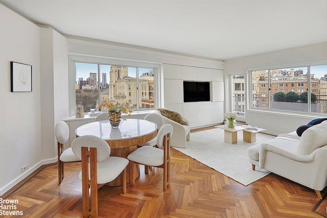 The foyer, an ornate hinge-opening trinket has a Cortina leather seating nook with a built in shoe cabinet. The floor is Calacutta marble slab and there is a chic and spacious coat closet. A hallway leads to the sun-drenched corner living room that boasts stunning views through perfect picture windows. The flooring is solid Cumaru herringbone wood throughout, while designer elements include modern base reveal, linear recessed lighting and an elegant bar with wine fridge. The large windowed eat-in kitchen features top-of-the-line Gaggenau and Miele appliances, complete with Kallista sink by Kohler and Blue de Savoie backsplash from the French Alps. The kitchen counters and flooring are Nano Glass Stone. Best of all is the window booth with views of Central Park, the perfect morning coffee spot. There is an adjacent windowed powder room that enjoys the same quintessentially New York scape.