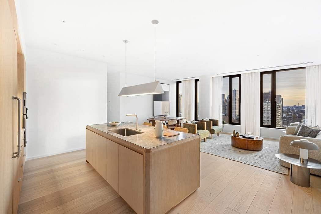 Upon entry, the foyer leads into a light-filled open plan kitchen and living/dining area that is crafted with a strong attention to detail. The Workstead-designed kitchen is crafted with raked maple cabinetry paired with satin nickel hardware, Gaggenau appliances. The kitchen features a statement island with inlaid Fior di Bosco stone slab and chamfered edges.