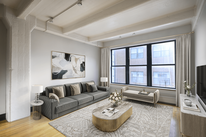 This well-configured one bedroom plus home office offers an opportunity to live in the much sought after Sweeney Building, a historic, landmarked full-service condominium in Brooklyn's beautiful waterfront enclave, DUMBO. Boasting 11 foot ceiling heights, hardwood floors, beamed ceilings and enormous windows, this southern facing apartment offers a quintessential loft living experience. The over-sized master bedroom offers an ensuite master bath with basketweave marble tiling, a whirlpool tub, separate shower and double sinks. The oversized home office, currently used as a bedroom, easily conforms to a nursery, office or den. The stainless steel chef's kitchen contains top of the line appliances, there is a generously proportioned laundry room, and ample closet space. The massive concrete construction provides whisper quiet living.