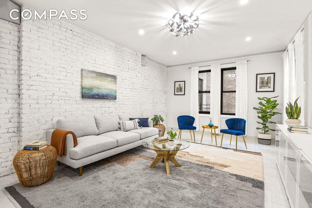 This unique and rarely available two bedroom, two bath co-op, in a coveted Windsor Terrace building, is just a heartbeat from Prospect Park. Renovated in 2018, this chic apartment has many advantages and lots to love! The entry gallery, 19' x 5'7" has a multitude of uses, and leads into a huge and stunning living room with two exposures that face the building's beautifully landscaped back gardens. The living room has an exposed brick wall and recessed lighting, with a boutique chandelier.