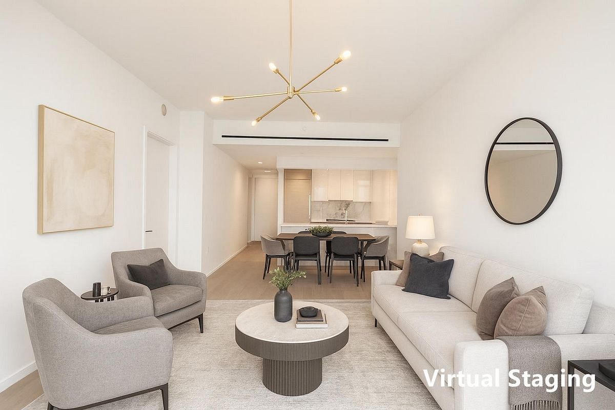 Residence 29D at Two Waterline Square is a remarkable one-bedroom, one-and-a-half-bath home that defines modern luxury living. Elevated on a high floor, this sun-filled residence showcases floor-to-ceiling windows with sweeping northern views of the Hudson River and Manhattan skyline. The open-concept living and dining areas are thoughtfully designed to balance comfort and sophistication, offering a seamless setting for both everyday living and stylish entertaining.