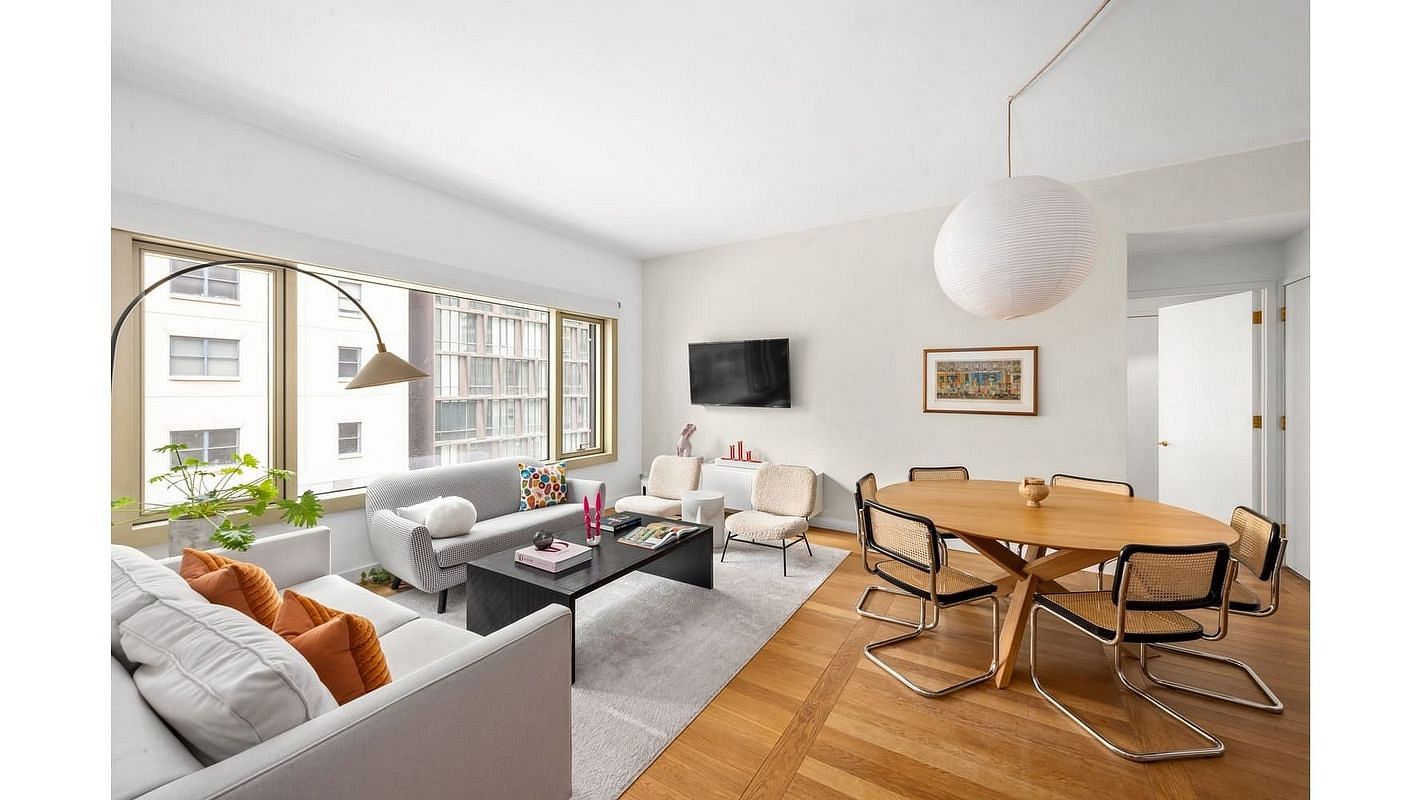 With 10-foot ceilings and a wide west-facing exposure, golden afternoon light pours into the expansive living and dining space - an ideal setting for intimate dinners, weekend lounging, or hosting friends before a night out in Tribeca.
