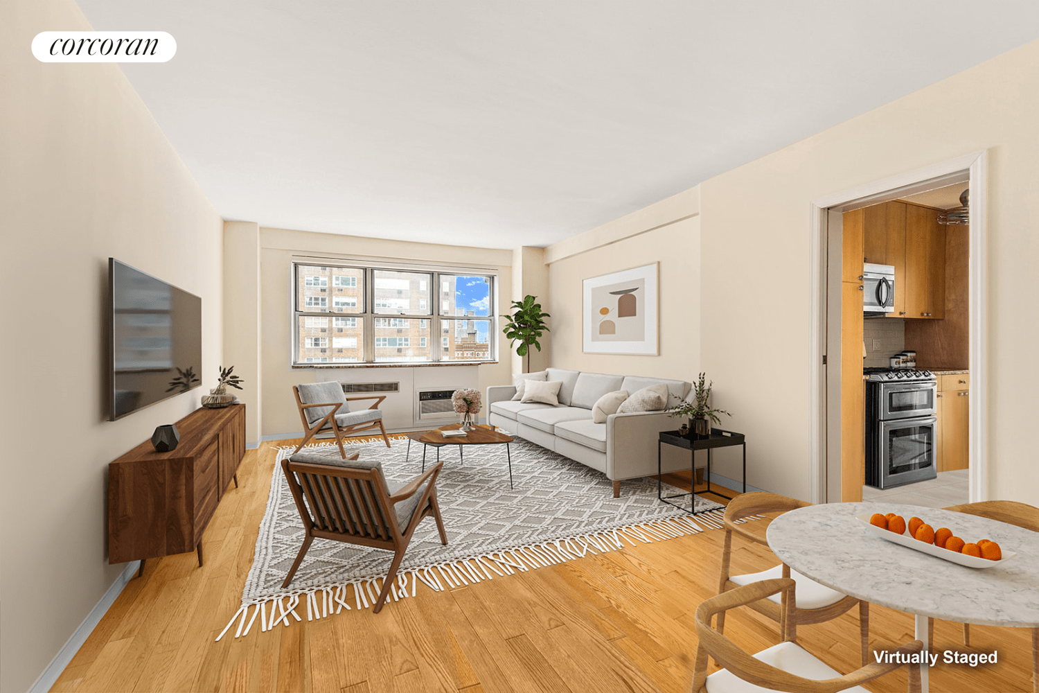Apartment 10XY boasts an expanded, extra-wide chef's kitchen plus a versatile bonus room: a Pantry / Wet Bar / Laundry Room with a full-sized Bosch W/D and a premium EuroCave wine fridge with a 235 bottle capacity. The kitchen is equipped with stainless-steel appliances, under-cabinet lighting, sous-chef station, and vintage-style double ceiling fans that tilt and rotate. The thoughtful renovation also includes new wood floors, new wall-through ACs, and custom window treatments. Relish bright skies and garden views in the wide living room that extends through a gracious dining area and foyer.