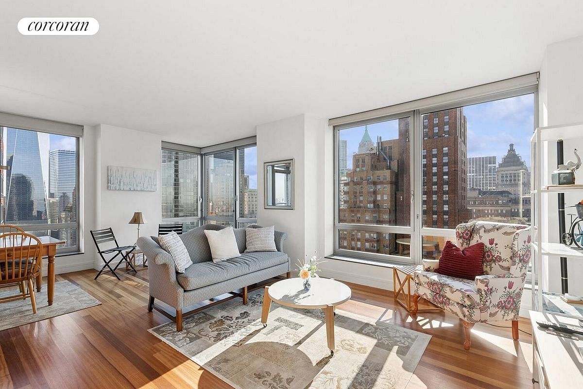 Coveted, spacious, high floor, corner 2 bedroom plus balcony home in mint condition with 2.5 baths now available for purchase at the luxurious Millennium Tower Residences. This 1,404 sq ft home has spectacular views northeast of 1 World Trade Center and Manhattan skyline, southeast of Battery Park and NY Harbor and to the west of the Hudson River. Upon entering the living room you are struck by the gorgeous Brazilian cherry wood floors as well as the light and views from your wrap around, floor-to-ceiling windows and your 9 ft ceilings. A spacious living room allows for both formal dining and entertaining. A chef's open kitchen is outfitted with top of the line appliances including Sub Zero refrigerator, Miele dishwasher, Viking gas range, Insinkerator food disposal and U-line wine cooler. The double exposure, primary bedroom has 2 walk-in closets with a 5 piece marble primary bath. A split second bedroom is extremely large with 2 closets and an en-suite marble bath. Luxurious finishes include wood flooring in living room, carpeted bedrooms, vented washer/dryer, filtered fresh air and powder room for guests.