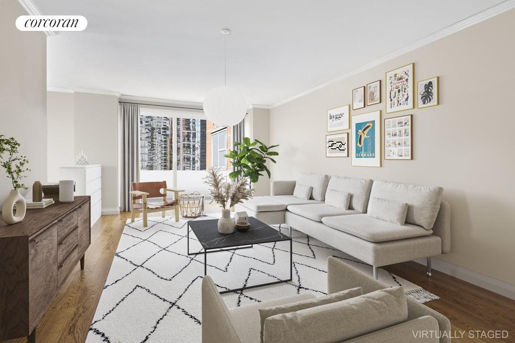 Offering over 1,100 sf of living space 21R also features a generous number of closets, including four clothes closets and one large walk-in closet. As you enter the large open formal foyer, your eye is immediately drawn to the landscaped balcony which borders the spacious sun-flooded living room perfect for entertaining. Currently configured as a fully functional home office with custom millwork, the dining L can easily be converted to a second bedroom or a full dining area. The windowed kitchen with partial East River views is finished with custom cabinets and modern appliances. A true oasis, the large bedroom has ample space for a full suite of furniture and access to a fully renovated windowed en-suite bath. Other features include solid hardwood oak floors throughout, radiant heat flooring in the full bathroom and crown molding. The entire apartment has been thoughtfully renovated and finished in a neutral color palette giving it a warm, comfortable feel. With south and west exposures, its corner layout makes it sunny and bright all day long.