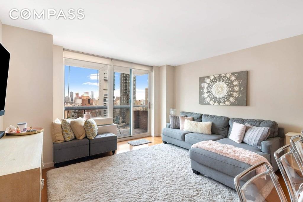 The living area is flooded with natural light, thanks to the incredible open views to the east. Large enough for a small table and chairs, the balcony offers the same views as well as an incredible view looking north up 2nd Avenue. The open layout seamlessly connects the living and kitchen areas, creating a perfect space for entertaining and relaxation.