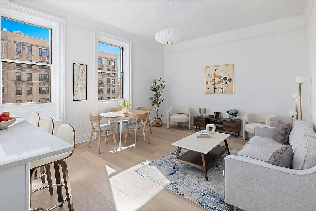 Presented by a sponsor with NO APPROVAL OR FINANCIAL REQUIREMENTS, this exquisitely renovated pre-war corner high floor apartment is move-in ready, offering two bedrooms and two bathrooms with awe-inspiring open-sky views. The timeless charm of pre-war architecture is flawlessly preserved, while every detail has been reimagined for modern living. Sunlight pours in all day from expansive southern and eastern exposures, filling the space with a luminous, welcoming glow. An oversized wall of windows, framed by soaring 10-foot ceilings, invites you to effortlessly entertain in the open living area, anchored by a stunning island seating four, all set atop elegant wide white oak plank floors.