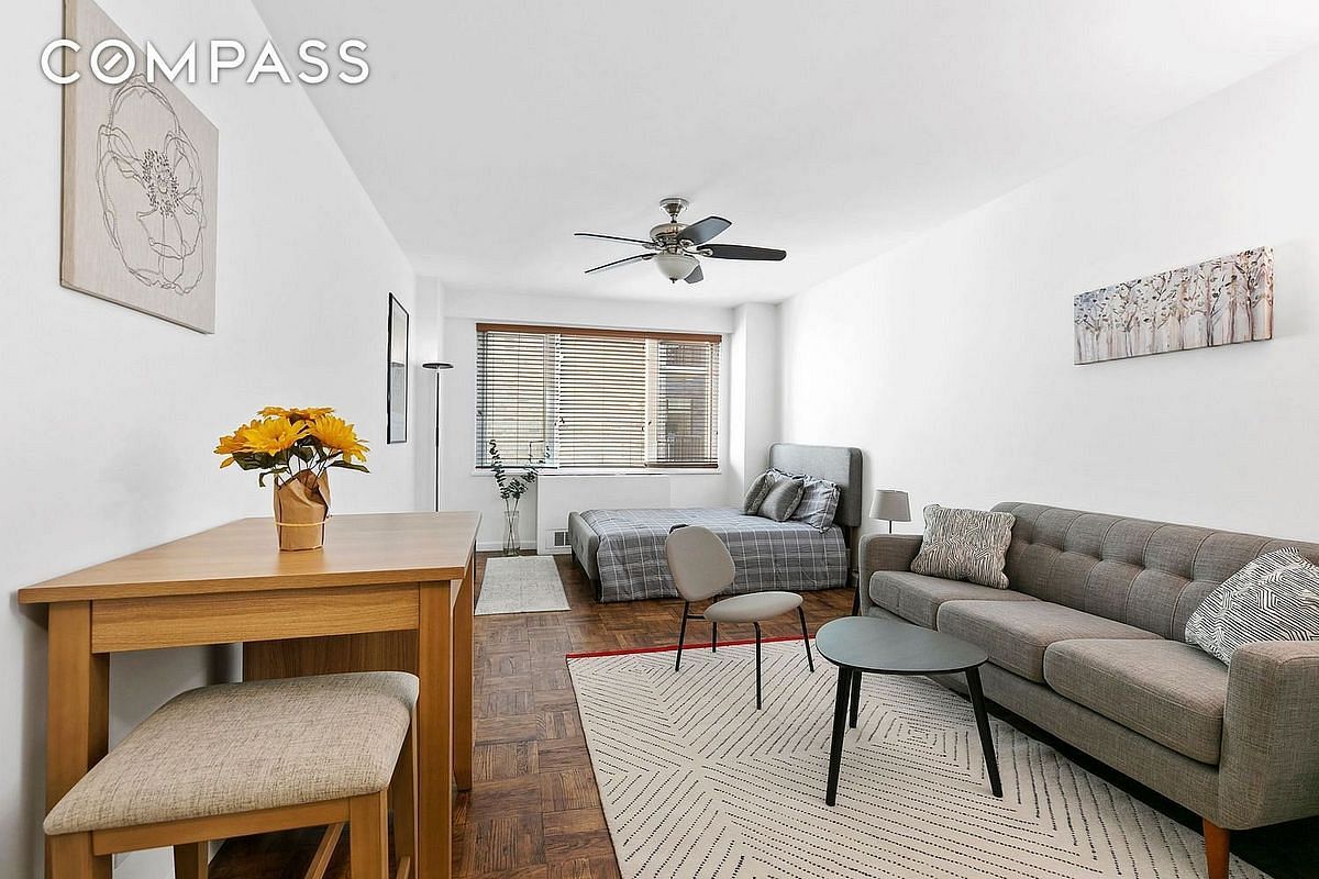 Why rent when you can own? Apartment 10B is the absolute perfect pied a terre or starter apartment. This move-in ready studio features a tastefully renovated kitchen with glass tile backsplash, granite counters, ceramic flooring and stainless appliances (including a dishwasher)! The renovated bathroom offers a bathtub with a glass enclosure, ceramic flooring and walls and an extended granite countertop. The large living space can easily accommodate a living, dining and sleeping area seamlessly. Enjoy your new home's Hunter Douglas ceiling fans, central air conditioning and heating, freshly painted walls and three closets for all of your storage needs.