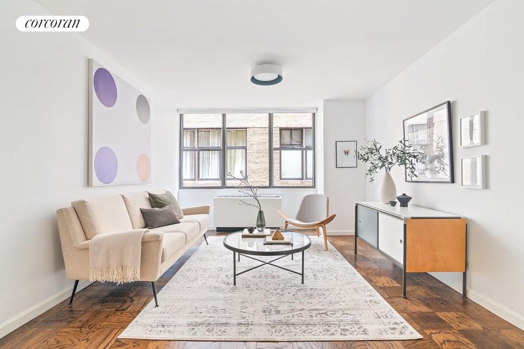 Upon entering the spacious living room, you are greeted by the ample dining area with seating for 4 and a beautiful new pendant light fixture. On the other side of the room is a large built-in closet with drawers and modular rods and shelves allowing for a variety of storage uses. The living room is comfortable and bright, illuminated gorgeously in the morning from the eastern facing windows.