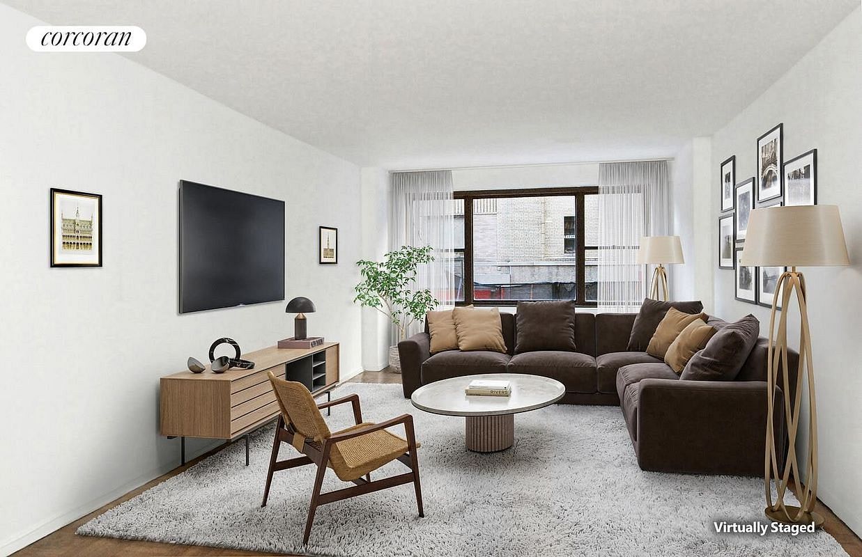 Attention Buyers: NO BOARD APPROVAL for this large, south-facing, corner 5 room residence, easily convertible to a three-bedroom. At approximately 1,500 sq. ft., the third bedroom / dining room / office space is extraordinarily long at 20 ft. All 3 bedrooms are split from each other, providing peace and solitude. Essentially in all-original condition, bring your contractor and architect to make this exactly your own. Maintenance is a remarkable $2/sq. ft. A monthly capital contribution of $113.05 began January 1st.